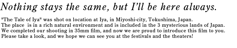 It was summer when a stranger from Tokyo arrived at “Iya”, where the riches of nature still abound. This young man, named Kudo, was willing to live his new, self-sufficient life. He was exhausted by city life, and believed this beautiful land would give him some rest. On the contrary, the reality was not as easy as he thought. There was a confliction between a local construction company and a group of nature conservationists. Farmers are trying to save their harvests from harmful animals such as deer and monkeys. People are fighting for their own purposes: to get their job, to save the environment, or to survive.